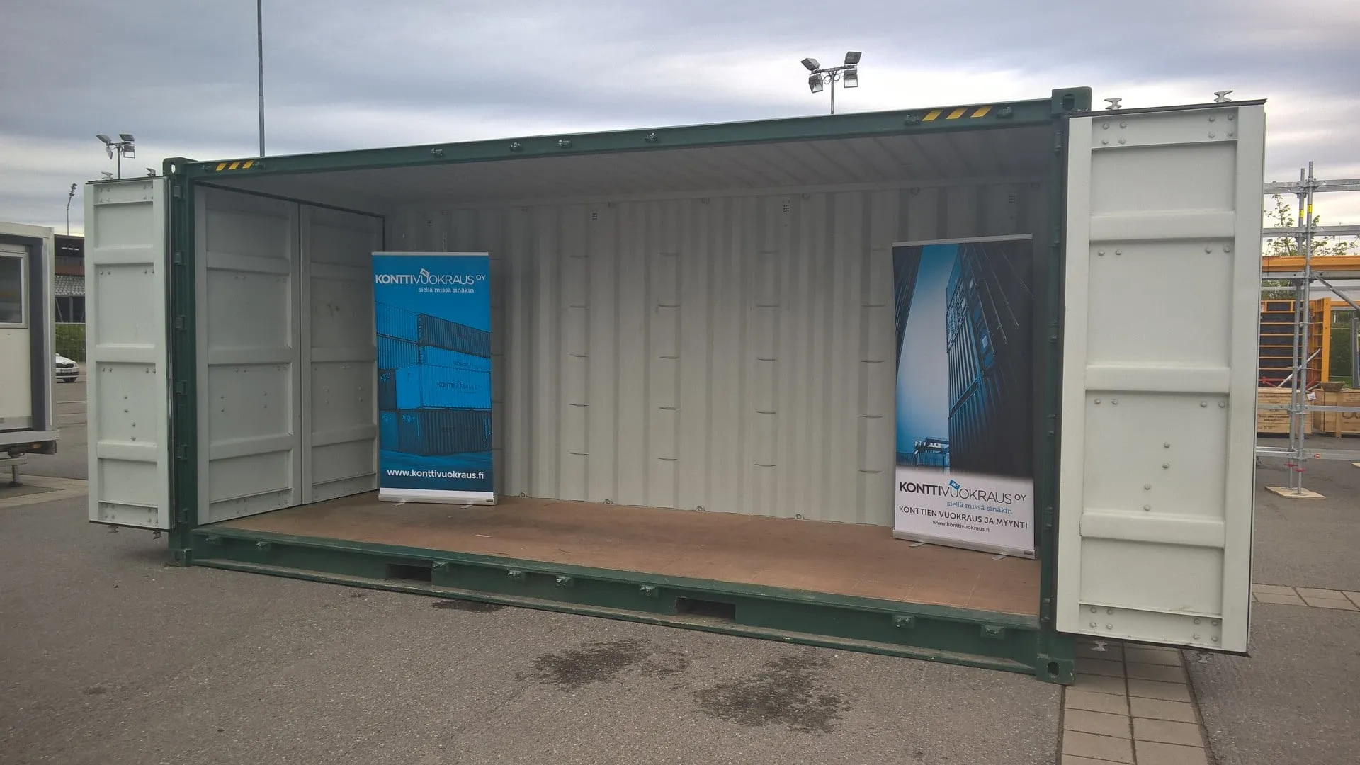A very practical container when you need a space solution that can be implemented quickly, for example for a trade fair, as a pop-up store, a performance stage or a promotional space. The container’s double doors and the opening side can be locked with padlocks, so you can leave all your belongings in the container after the event and continue the next day without any extra moving of the goods. The model is also very popular for project use when you need to load cargo from the side with a forklift or need an equipment shelter, making installation very easy