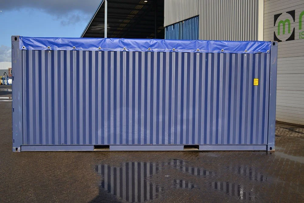 Open Top Containers are containers built for freight use, with a tarpaulin instead of a steel roof. The cover can be removed during loading, to enable top loading of overly high products. The 20′ Open Top Container has removable support bars under the tarpaulin and a TIR cable for fastening the tarpaulin to the container. All our Open Top Containers are approved for international freight transport (CSC). New and used 20′ Open Top Containers are available with fast delivery.
